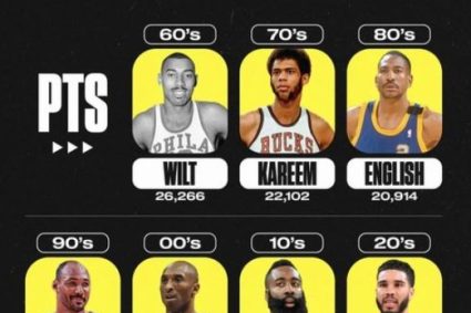 Scoring King of NBA times: 1960 s: Chamberlain (26266 points) 70’s: Jabbar (22102 points) 80’s: inkleish (20914 points) 90’s: Malone (21267 points) 00’s: Kobe (21671 points) 10 s: Harden (19578 points) 1920 s: Tatum (6849 points)